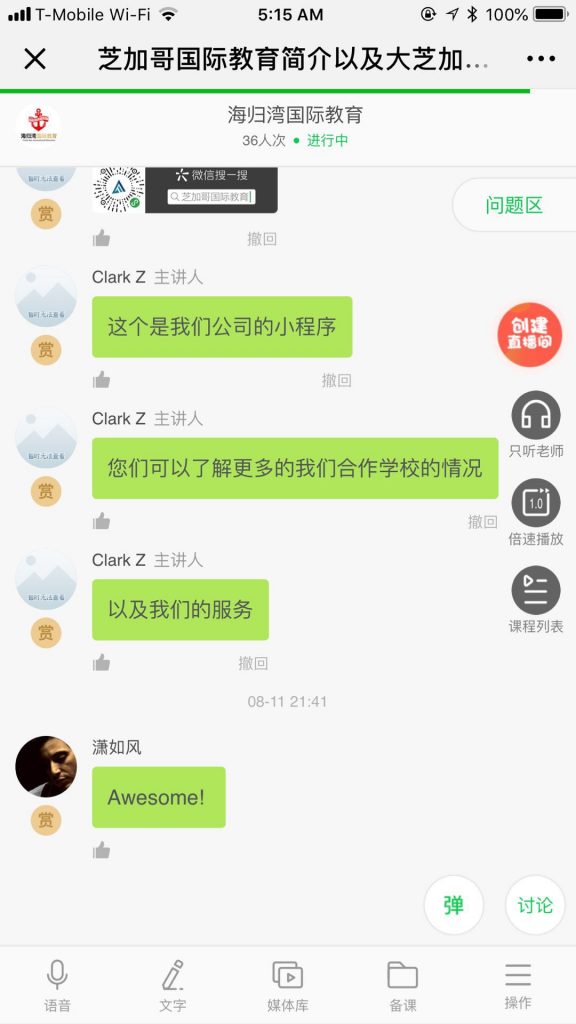 8月11日,Clark在海归湾国际教育家长群介绍芝加哥国际教育和芝加哥地区名校。
